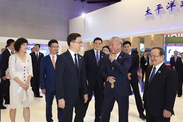 开幕大会后,韩正在广西壮族自治区党委书记鹿心社,广西壮族自治区党委副书记、自治区人民政府主席陈武等自治区领导的陪同下,视察了位于博览会主展馆的太平洋建设展位。