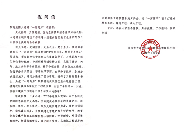 1月3日,棒球下注 第十建设集团承建的湖南省益阳市大通区“一河两岸”综合整治PPP项目收到当地业主单位发来的感谢信。