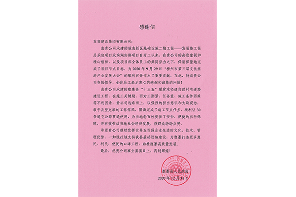 建设第二十一集团收到来自广西柳州市鹿寨县政府的感谢信,及县住建局关于柳州市第三届文化旅游大会相关项目建设先进单位的表扬牌匾,对集团在鹿寨项目建设中的出色表现和突出成绩给予肯定并深表感谢。