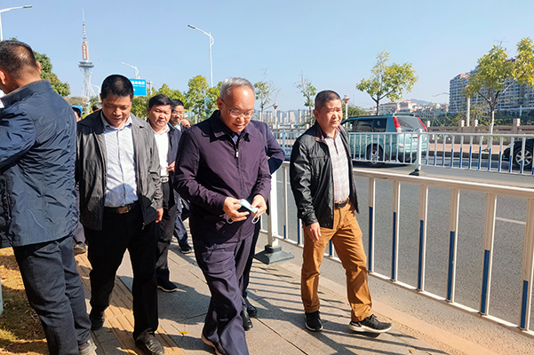 系建设第六集团承建的河源市源城区东埔河污水治理及管网改造项目现场,六集团源城区项目经理耿天利陪同视察。