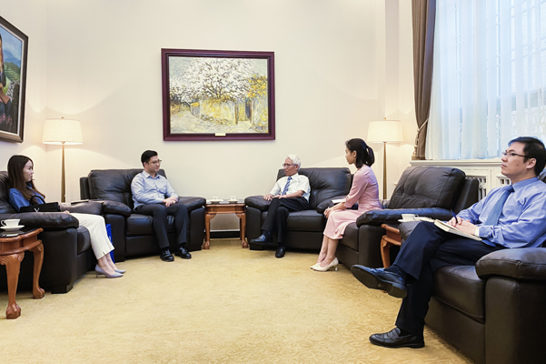 会谈中,王健闯对大使馆多年来给予集团的关心和支持表示感谢,并汇报了集团在越南投资建设进展情况。他表示,作为中国最大的城市经营商,企业始终专注基建主业,倾力服务国内外基础设施建设和经济社会发展,积累了丰富的国际项目投资与建设经验。越南是集团的重要战略市场,在与各地的长久合作中,我们始终秉承“智慧、良心;吃苦、吃亏”的匠心精神,投身当地建设,赢得社会各界广泛支持。接下来,我们将充分发挥“资源、智慧、资本”叠加优势,不断探索实践基础设施产业建设新理念与商业模式多角度延伸,加大资源投入力度,推动更多领域的合作落实,为越南各地建设发展做出积极贡献。