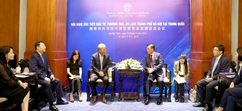 严介和同越共中央政治局委员、河内市委书记丁进勇会谈