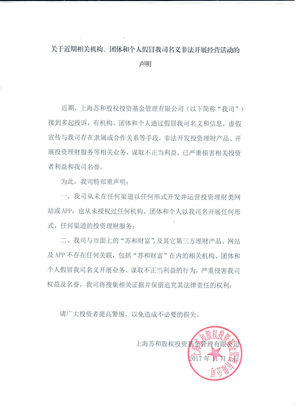 上海苏和股权投资基金管理有限公司关于近期相关机构、团体和个人假冒我司名义非法开展经营活动的声明